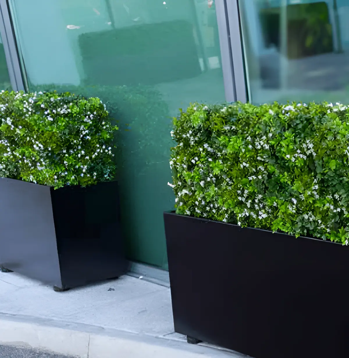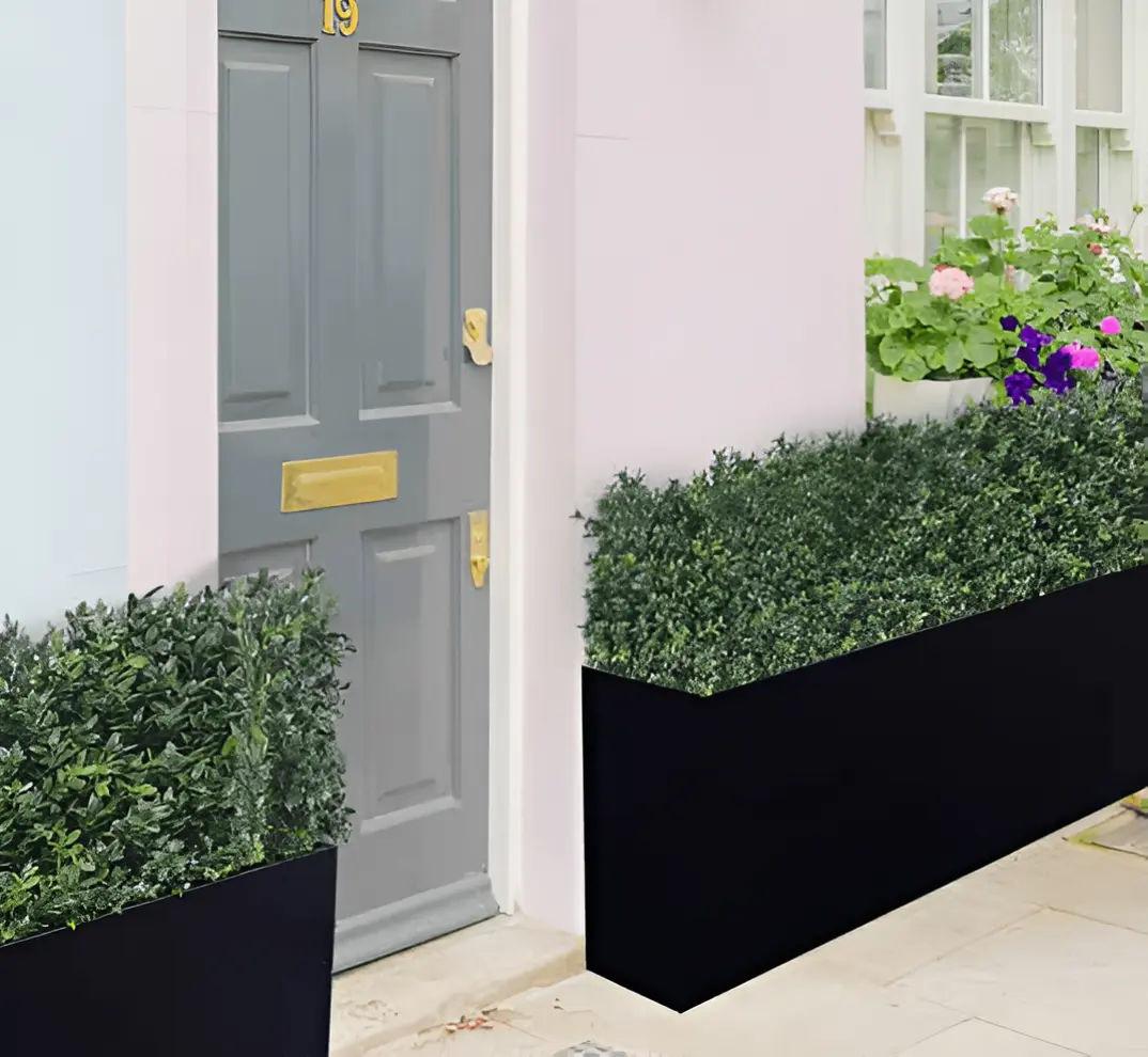 The Luxury Boxwood Hedge comprises UV Stabilised & Fire Rated artificial foliage fixed with stainless steel ties to a powder coated stainless steel frame.